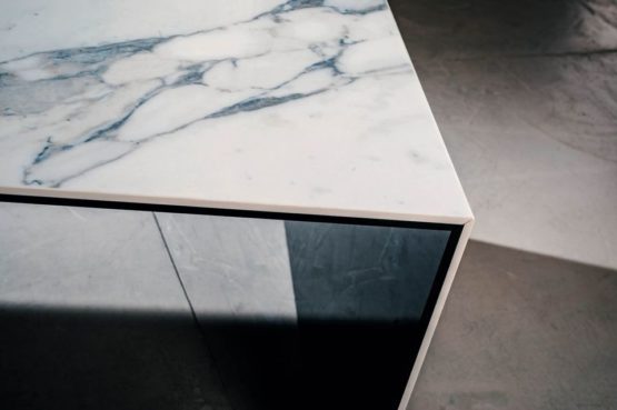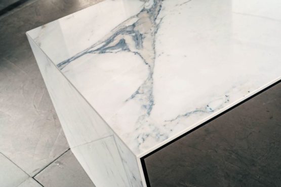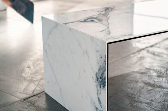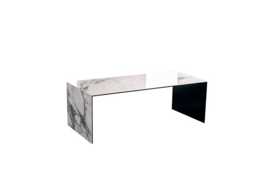 Il tavolino da salotto ARABESQUE ? un ponte composto di 3 lastre?di ceramica finitura marmo bianco incollate sul bordo per ottenere la classica forma a ponte. Ogni lastra ? realizzata con l’unione di una ceramica laminata unita ad un vetro che funge da supporto.