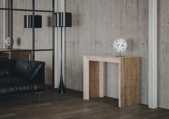La Consolle Ginevra realizzata con angoli smussati a 45ยฐ esaltano lโeleganza di un mobile di pregio e la praticitร un elemento dโarredo capace di trasformarsi in poche mosse in un tavolo.Realizzata con pannelli di nobilitato e dotata di sostegni centrali per assicurare stabilitร e resistenza quando la consolle รจ estesa.